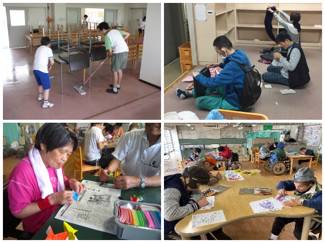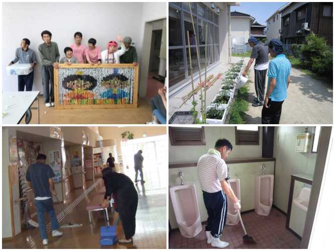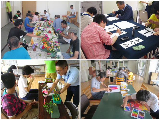 利用者の方やご家族と相談して、日中は、それぞれの興味や能力に応じた活動班に分かれて、軽作業や創作活動を行っています。また、行事等では近隣の地域団体とイベントを通して交流を深めています。休日は、絵画教室や華道、習字などの文化的活動を主に行っています。夜間は、個々の趣味の時間でゆっくりと過ごされたり、健康体操や体力づくりなど健康づくりの時間に利用されています。