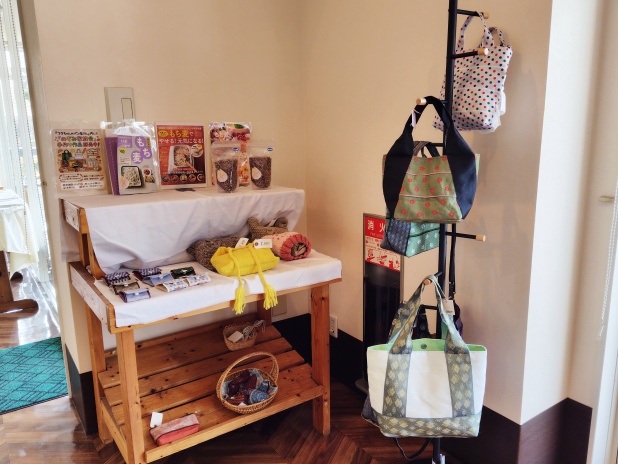 販売コーナー こだわりのもち麦と、のぞみ家族会の皆さんが手がけた素敵な作品を販売しています。