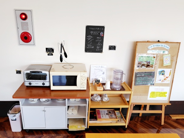 イートインコーナー セルフのお水に加え、電子レンジとトースターを完備。お買い上げいただいたパンを、ぜひ温め直して熱々でお召し上がりください。